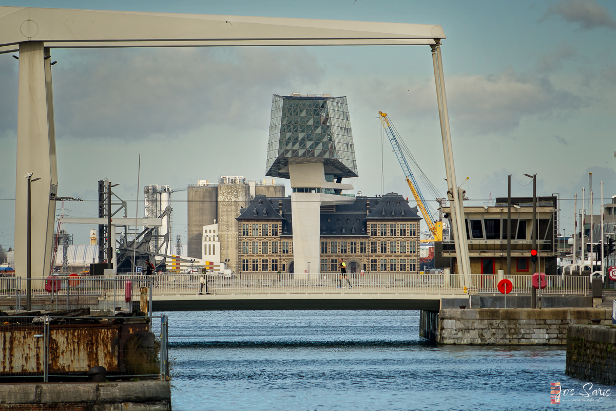 Als eerste passeren wij het monumentale gebouw van het Loodswezen van de haven van Antwerpen. Recht tegenover ligt het Museum aan de Stroom (MAS). We steken een parkeerplaats over en lopen onder oude indrukwekkende kranen door die hier in slagorde staan opgesteld.