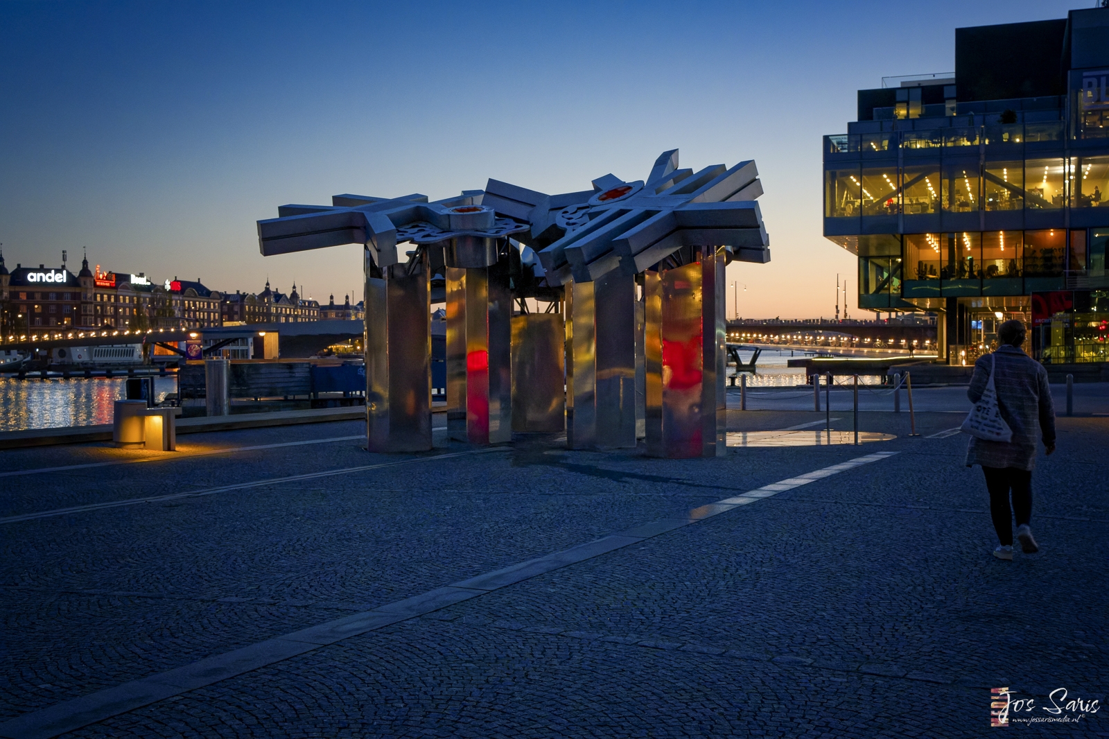 Na mijn bezoek aan Slot Rosenborg loop ik naar de Marmerkerk, onderdeel van AmalienborgMarmerkerk. En passant neem ik ook nog de aflossing van de wachtposten mee. Vervolgens loop ik naar de The Black Diamond Bibliotheek en kijk naar de zonsondergang en het invallen van de avond.