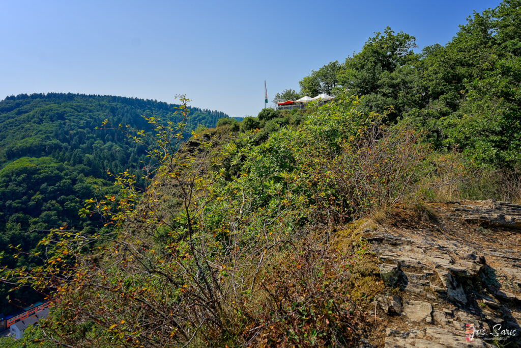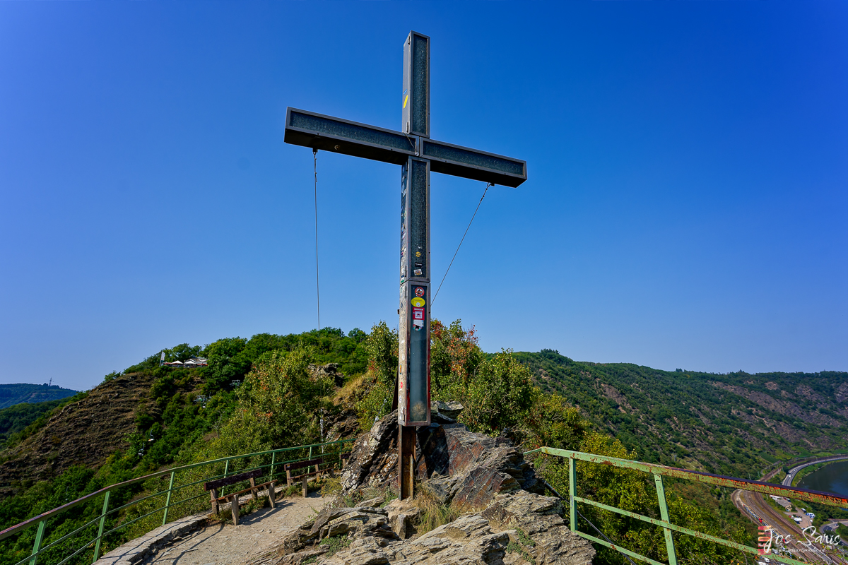 Wandelaars kunnen vanaf hier nog verschillende routes volgen, maar wij genieten vooral van het uitzicht. Het Pinnerkruis is een markant herkenningspunt, en vanaf dit plateau kijk je ver uit over de Moezelvallei en het stadje dat uitnodigt tot verdere ontdekking.