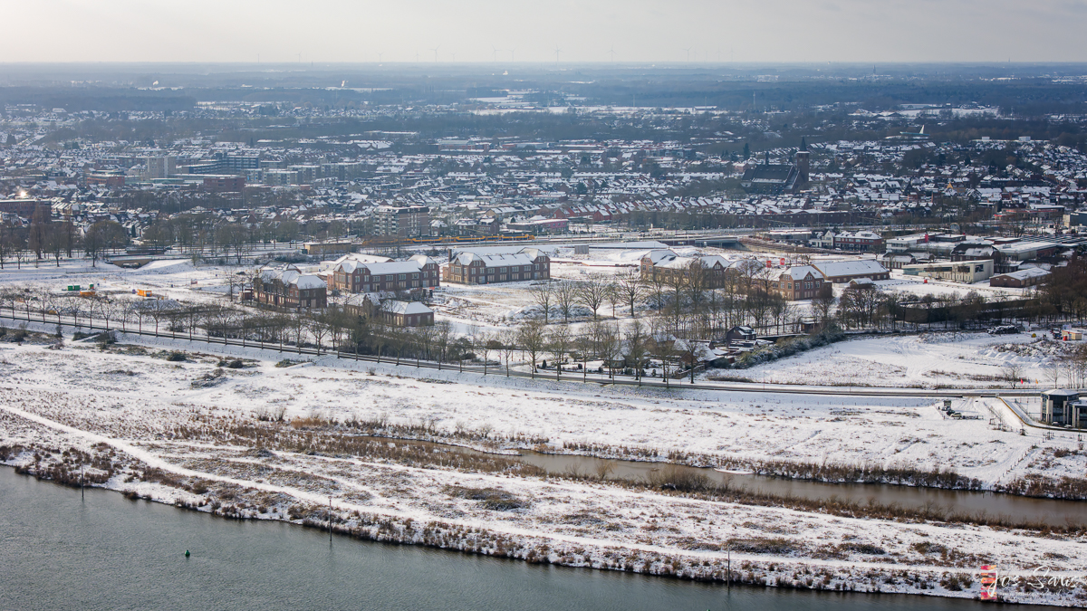 Ik zoom uit in panorama-modus voor een breedbeeld van het park en de omliggende wijken. Op 100 meter hoogte speelt de wind de drone parten. Ik laat de drone dalen tot 70 meter voor de 360° panorama opname. De Air 3’s 48MP-sensor legt de details haarscherp vast, van de textuur in de sneeuw tot de voetstappen erin. Ik maak ook een filmpje met een shot dat begint aan de Blerickse kant van de Maas en eindigt bij het Julianapark.