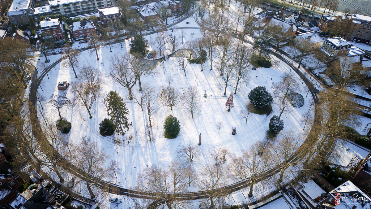 Onder een zwaar bewolkte hemel, met sneeuwbuien die even een pauze inlassen, stijgt de DJI Air 3 rond het middaguur op. De drone glijdt geruisloos omhoog, terwijl grijze wolken de wereld in een zachte sluier hullen. De vlakke sneeuwlaag transformeert het park in een feeëriek winterlandschap, sereen en uitnodigend voor mijn lens.