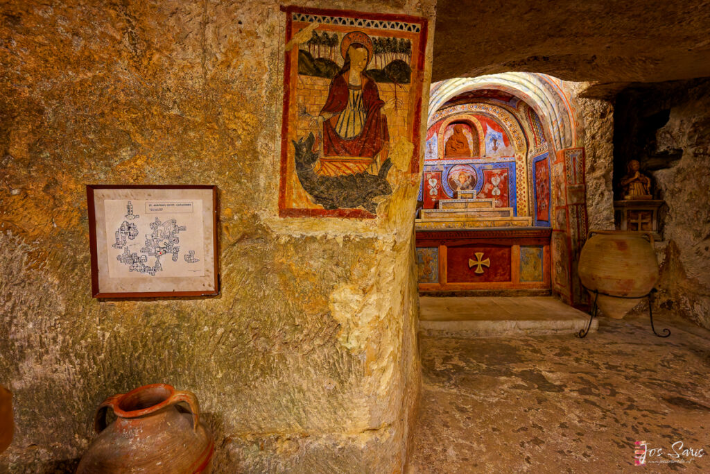 Vanuit de grot hebben we direct toegang tot de bijbehorende kapel, die, in tegenstelling tot de helaas gesloten grote Basilica of St Paul bovengronds, wel open is. De kapel is intiem en straalt een devote rust uit.